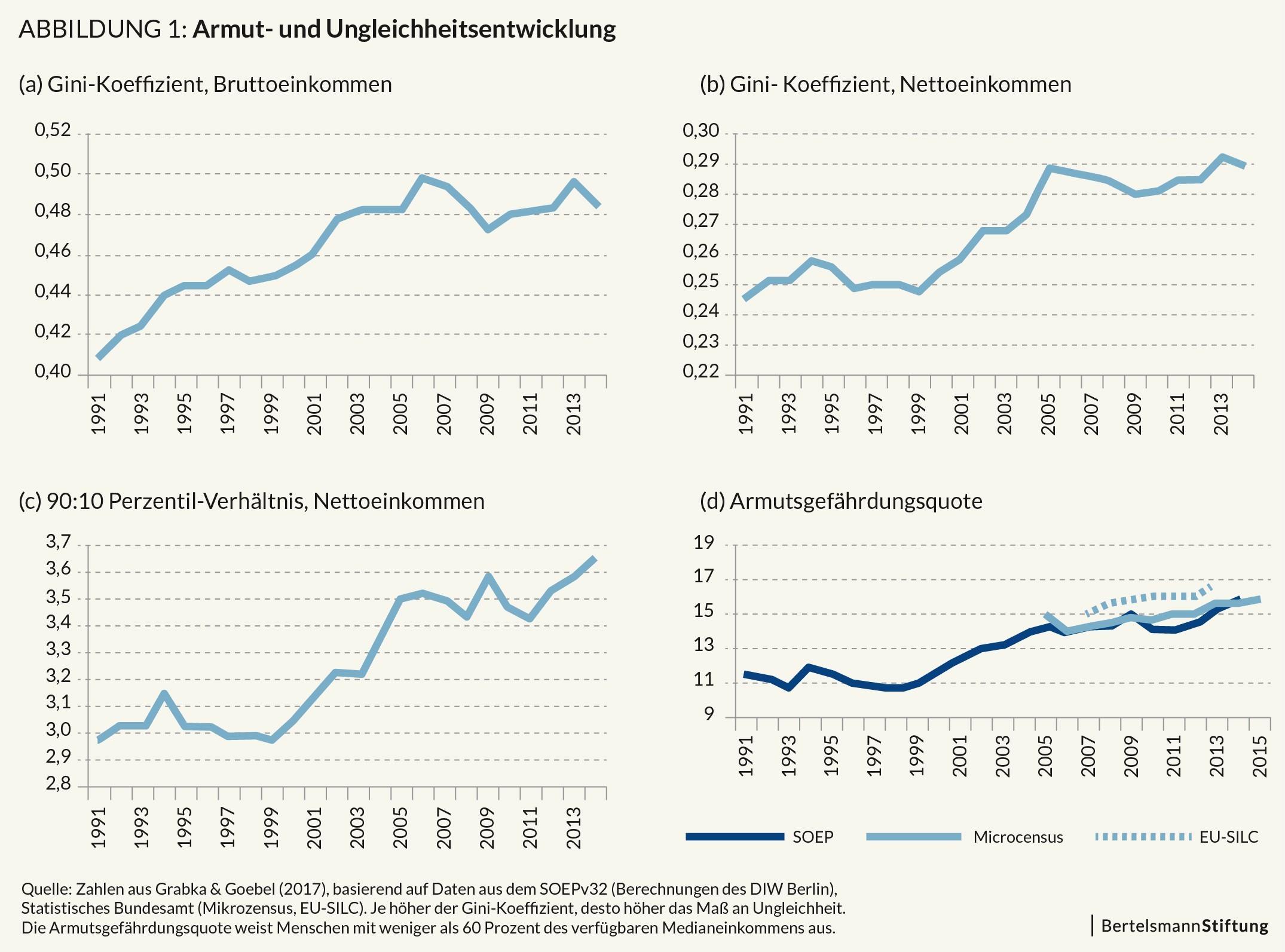 Deutschlands Wirtschaftswachstum ist schon seit Jahren nicht mehr so inklusiv wie es früher einmal der Fall war. Das zeigt eindrücklich die folgende Grafik, welche die Entwicklung der Einkommensunterschiede bzw. der Armutsgefährdungsquote seit 1991 unter verschiedenen Aspekten betrachtet.