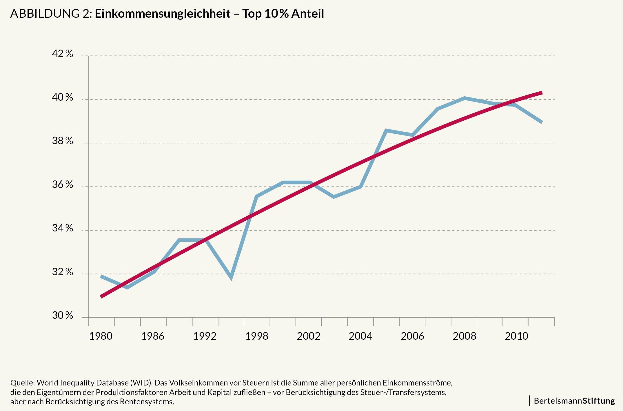 Infolgedessen stiegen die Unternehmensgewinne schneller als die Löhne, was zu einem Rückgang der Lohnquote führte – dies wiederum führte dazu, dass Spitzeneinkommen schneller stiegen als die Einkommen der allgemeinen Bevölkerung. Abbildung 2 zeigt die Entwicklung des Top-10-Einkommensdezils (der Anteil des Volkseinkommens, der auf die oberen 10 % entfällt) seit 1980 – der Anstieg von etwa 10 Prozentpunkten bis 2011 sticht dabei hervor.