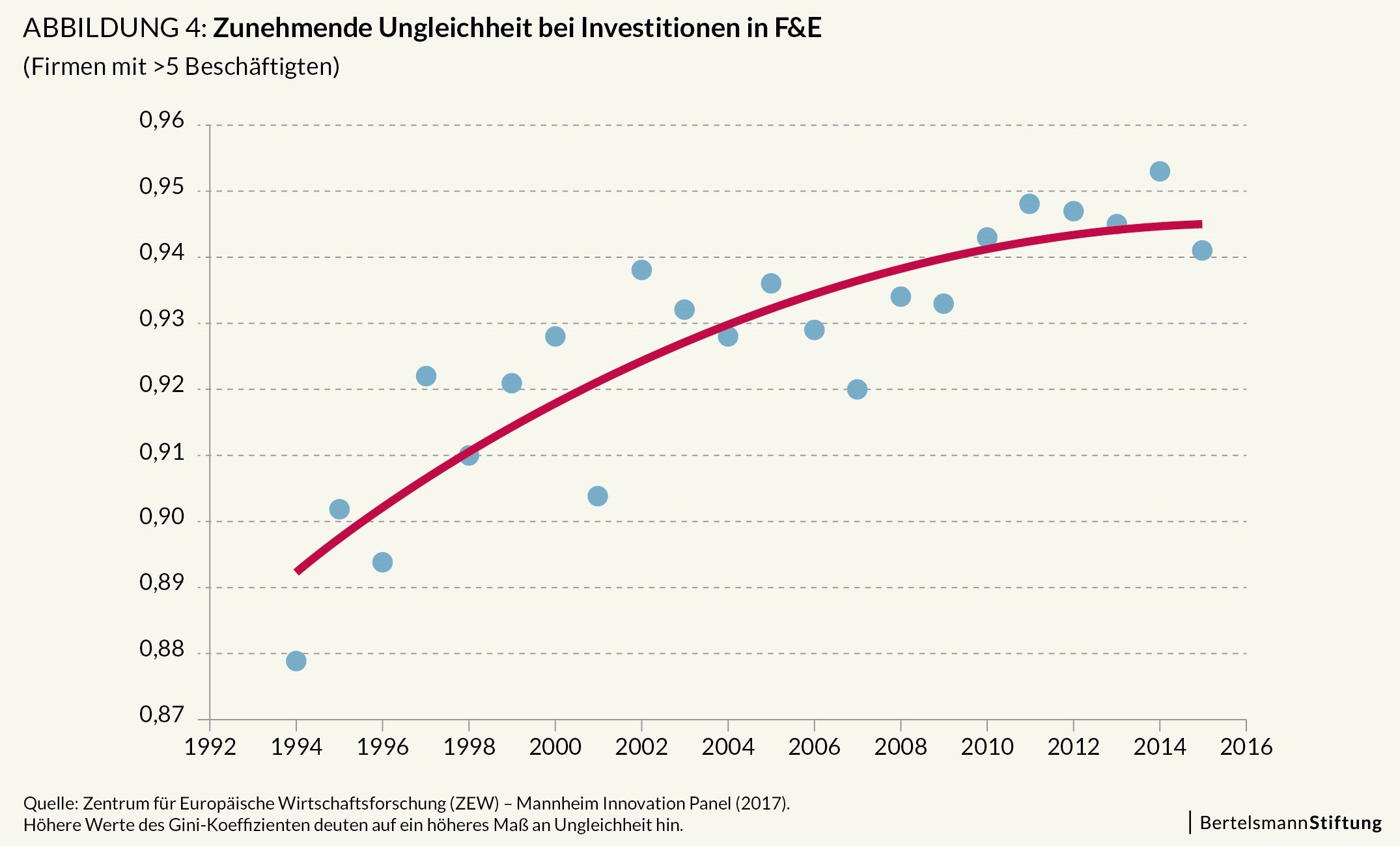 - Drittens: Zwar sind die Gesamtausgaben für F&E hoch, sie konzentrieren sich jedoch auf größere Unternehmen. Die meisten Unternehmen in Deutschland investieren in der Tat nichts oder nur sehr wenig in F&E. Ein Indikator für die „Ungleichheit“ oder Konzentration der F&E-Investitionen von Unternehmen ergab, dass diese Ungleichheit mit einem Gini-Koeffizienten von rund 0,94 bis 2015 stark angestiegen ist, wie die folgende Grafik zeigt: