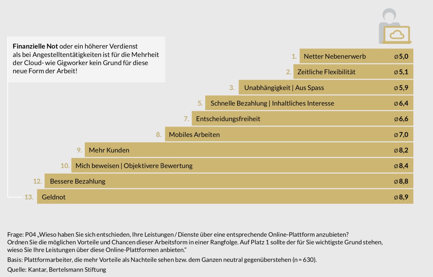 - Plattformarbeit wird vom Großteil der dort auf diese Weise Tätigen sehr geschätzt wegen ihrer Flexibilität und der Möglichkeit zur freien Arbeitsgestaltung.