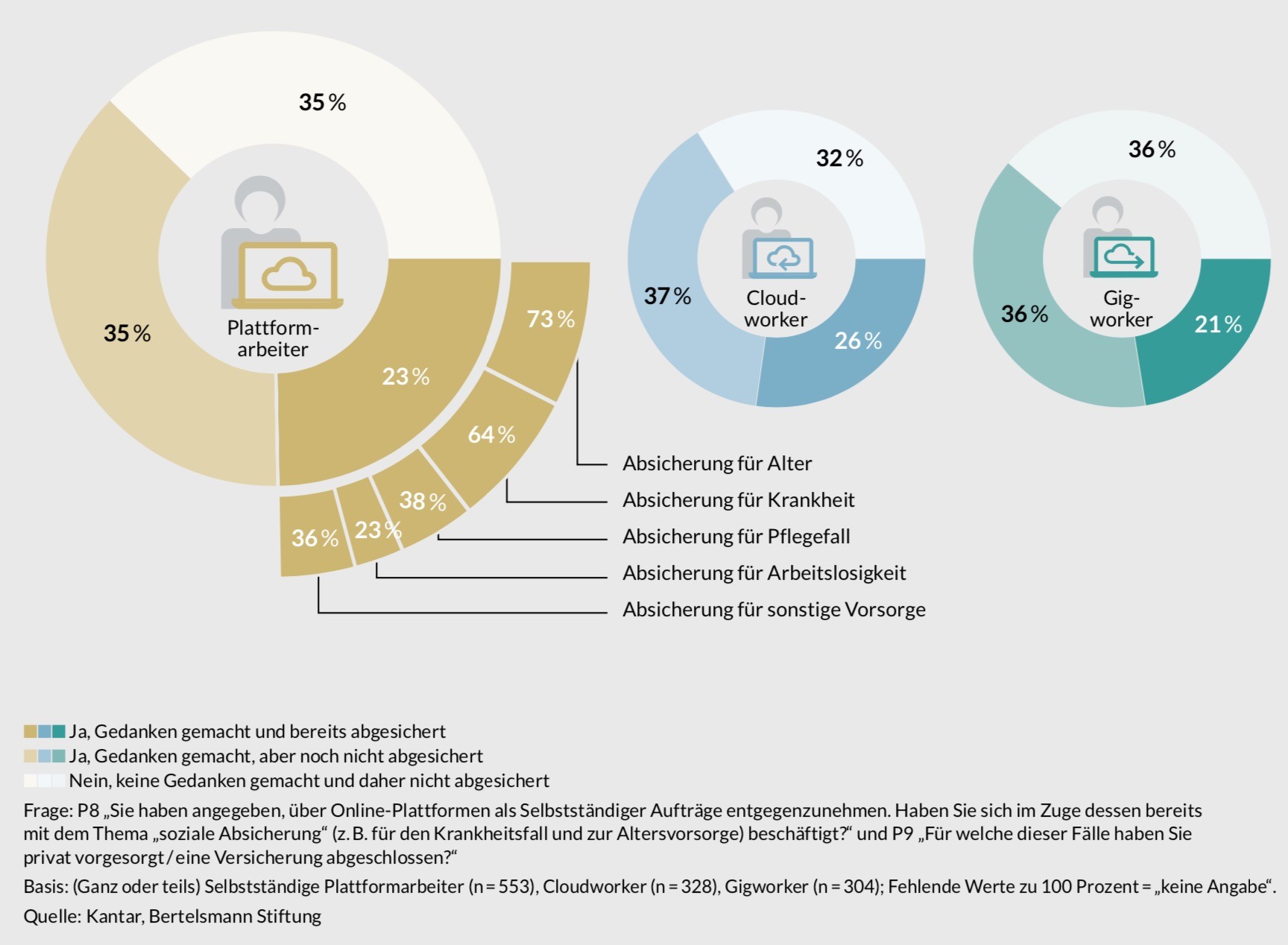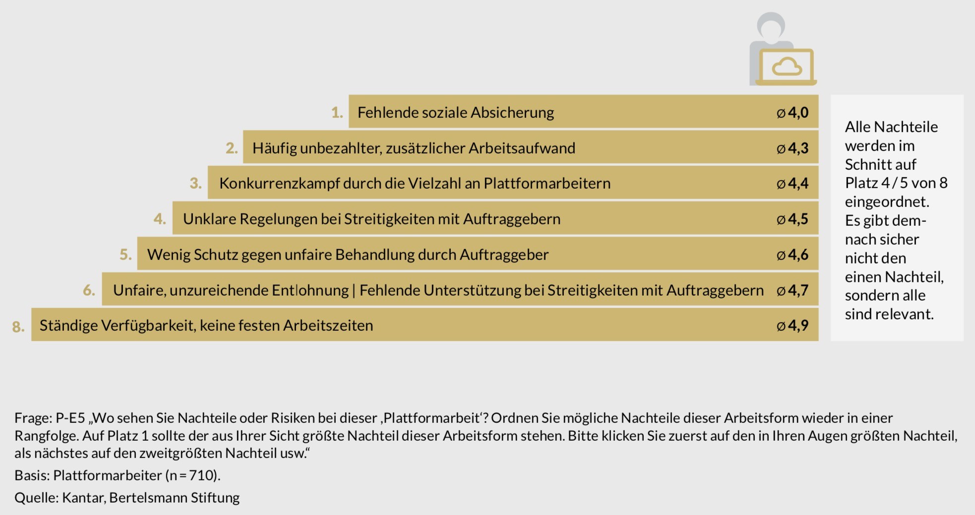 - Zugleich kritisiert eine deutliche Mehrheit der Plattformarbeiter stark die fehlende soziale Absicherung (Krankheit, Alter, Berufsunfähigkeit).
