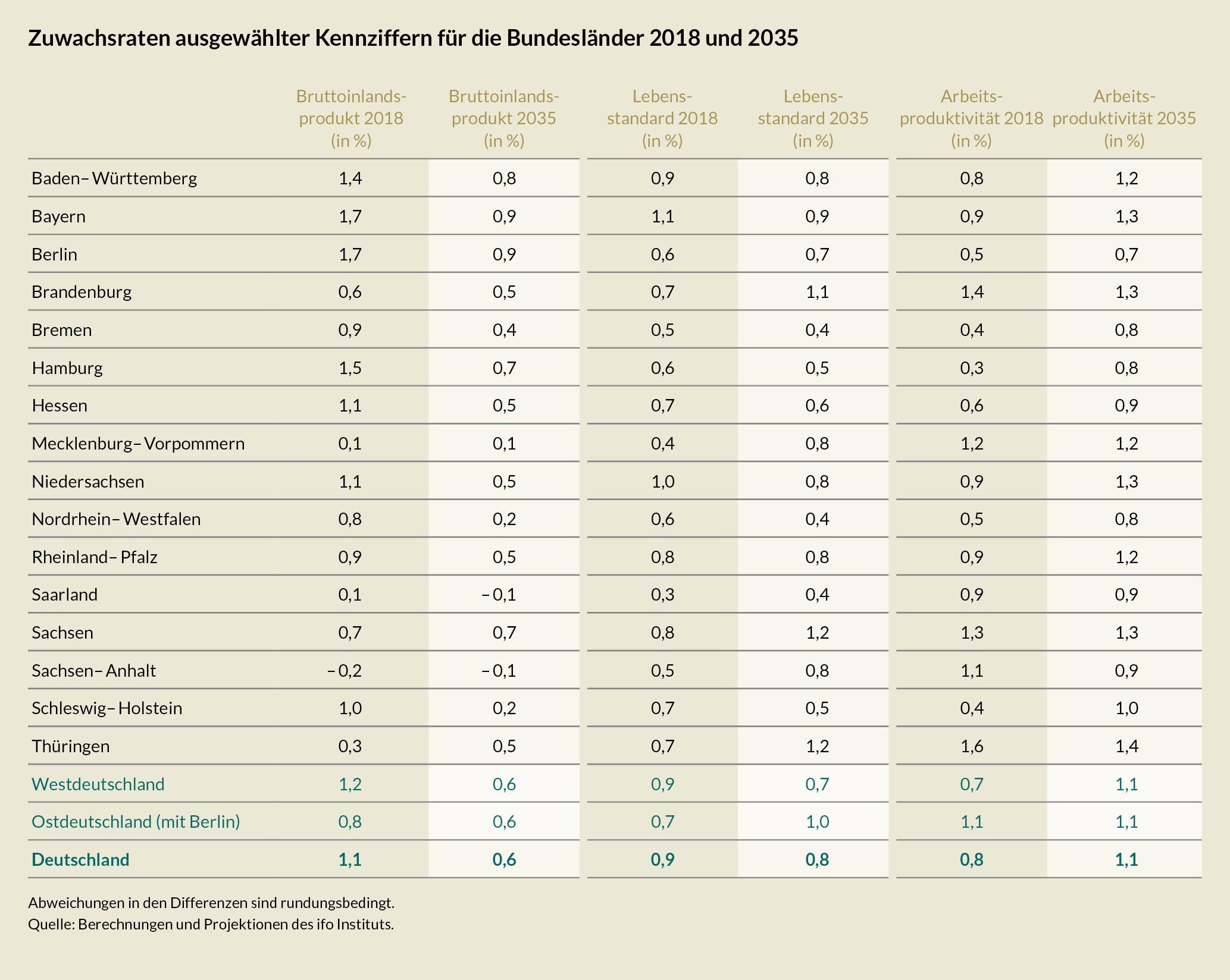 Entsprechend stehen die Bundesländer vor erheblichen Anstrengungen, wollen sie keine Wohlfahrtseinbußen hinnehmen. Bis in das Jahr 2035 schrumpft die Zahl der Erwerbstätigen in der Projektion in allen Bundesländern mit Ausnahme von Berlin stärker als die Gesamtbevölkerung. Das bedeutet letztlich: Immer weniger müssen künftig immer mehr erwirtschaften – das heißt, sie müssen noch produktiver werden. Vor den größten Herausforderungen stehen dabei die ostdeutschen Regionen Sachsen-Anhalt, Thüringen und Brandenburg genauso wie die strukturschwachen Regionen Saarland und Rheinland-Pfalz im Westen. Um den Rückgang der Erwerbsbevölkerung auszugleichen, müssen diese Regionen ihre Produktivität um 0,4-0,8 Prozentpunkte steigern, wollen sie das Wachstum ihres heutigen Lebensstandards zumindest konstant halten. Es wird also deutlich: Obwohl die Produktivität jedes Jahr zulegen wird, so wird jener Zuwachs nach derzeitigem Stand nicht ausreichen, um den Rückgang der Erwerbsquote aufzufangen – es ergibt sich nach heutigem Stand eine „Produktivitätslücke“.