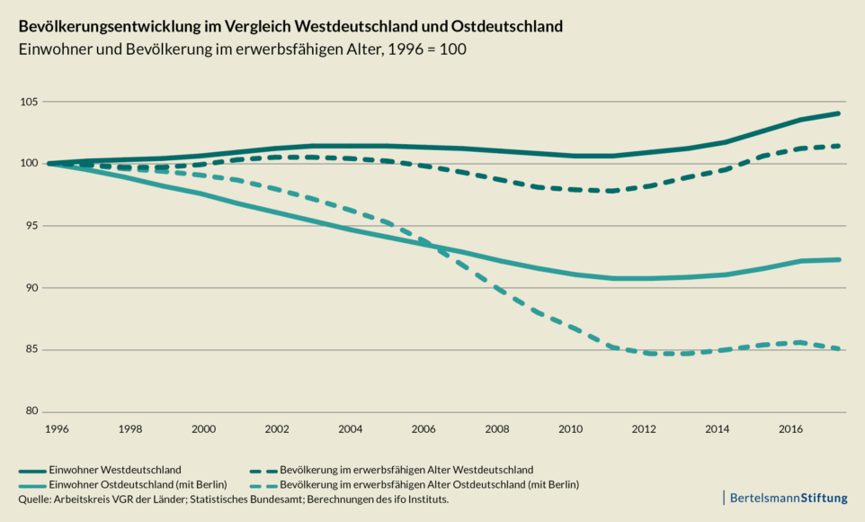 Zwei Entwicklungen sind besonders bemerkenswert wie die untenstehende Abbildung verdeutlicht. Erstens sind die Gesamtbevölkerung und die Bevölkerung im erwerbsfähigen Alter in Ostdeutschland (mit Berlin) stärker geschrumpft als in den westdeutschen Bundesländern. In Westdeutschland ist die Bevölkerungszahl gegenüber dem Jahr 1996 merklich gestiegen, auch bedingt durch die seit 2015 verstärkt eingesetzte Zuwanderung.