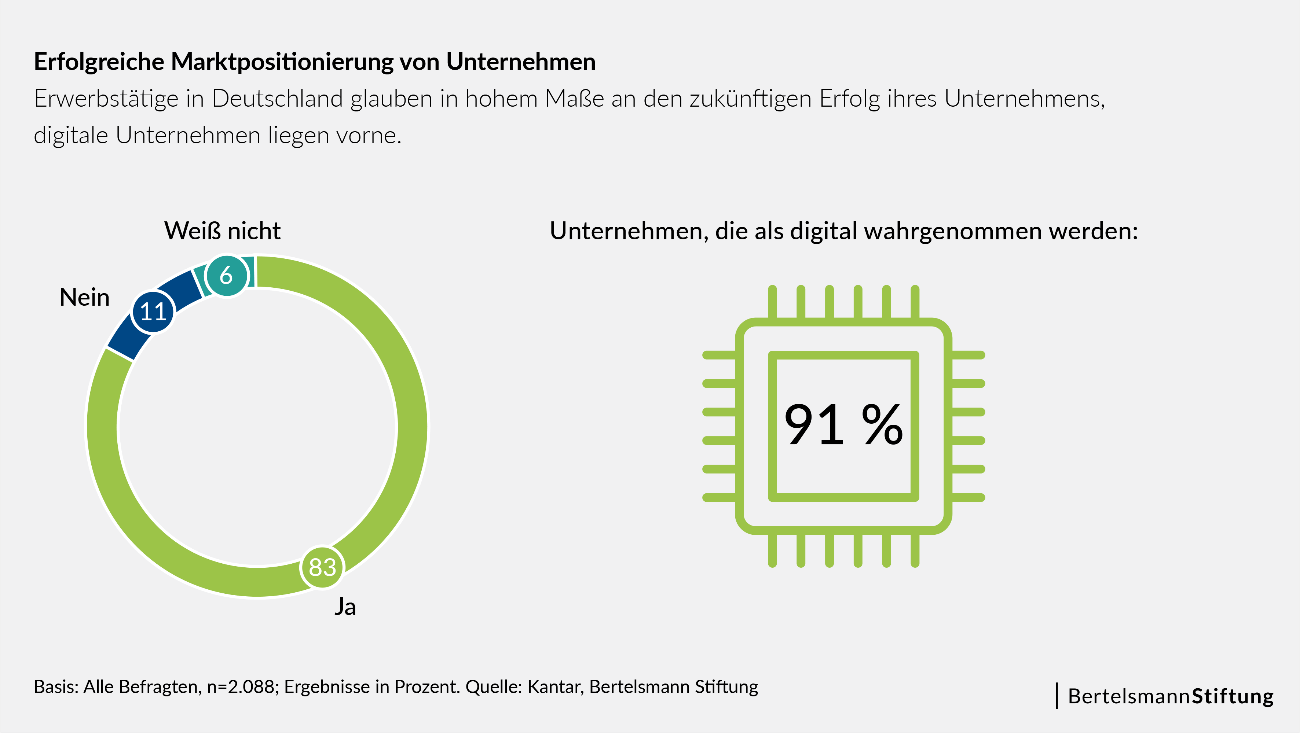 Durch ihren transformierenden und disruptiven Charakter zwingt die Digitalisierung der Arbeitswelt Unternehmen dazu, ihre eigene Zukunftsfähigkeit unter Beweis zu stellen. Die Ergebnisse der Befragung zeigen, dass die Erwerbstätigen in Deutschland in einem erstaunlich hohen Maß (zu 83 Prozent) an die richtige Marktausrichtung ihrer Unternehmen glauben – je digitaler Unternehmen sind, desto positiver die Prognosen.