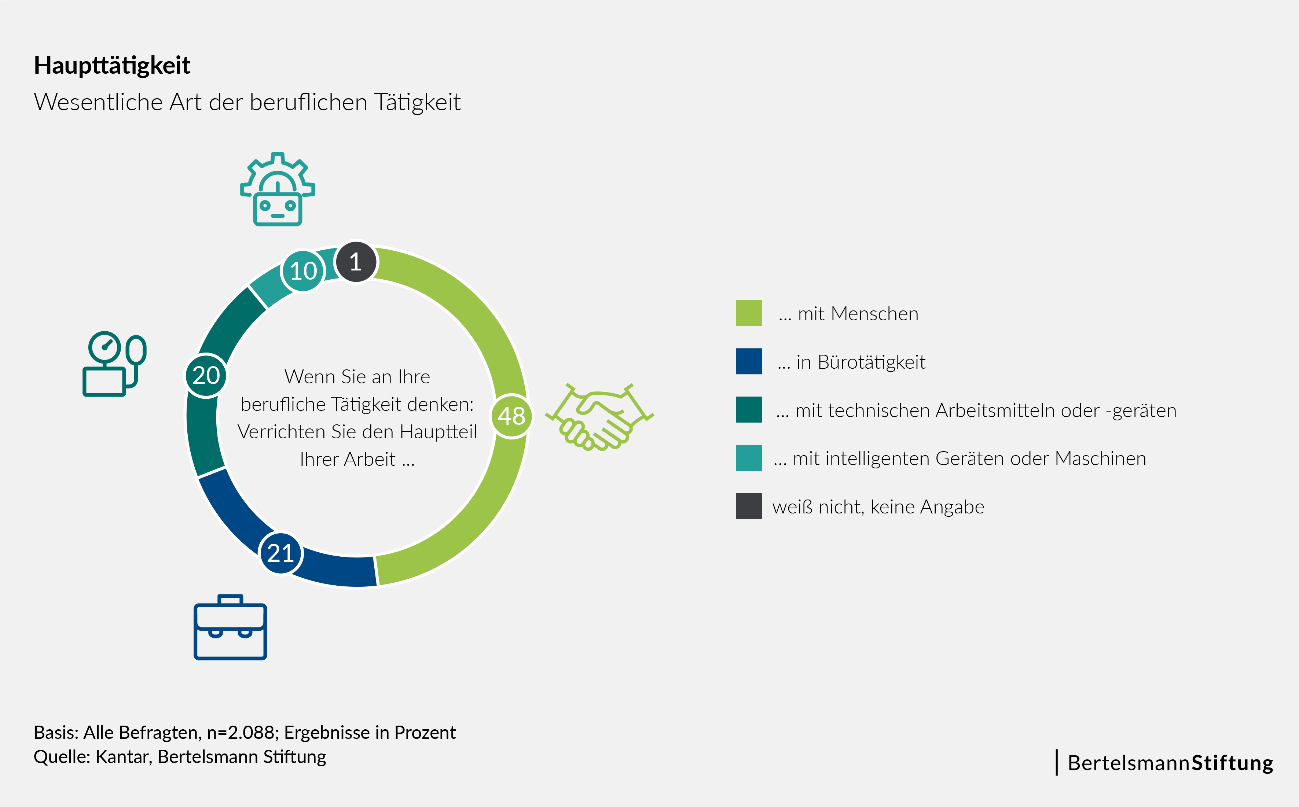 Dieser hohe Anteil der Befragten, der angibt, überwiegend mit Menschen zu arbeiten, ist beachtlich und verdeutlicht, wie sehr man den sozialen und zwischenmenschlichen Kontext bei der digitalen Transformation der Arbeitswelt berücksichtigen sollte. Da das Ergebnis auf der Selbsteinschätzung der Befragten basiert, ist es sehr wahrscheinlich, dass insbesondere Menschen mit einem Bürojob bewusst entscheiden mussten, ob der Hauptteil der Arbeit auf die Interaktion mit Menschen oder die Tätigkeit am Schreibtisch entfällt – und viele scheinen sich für Ersteres entschieden zu haben. Diese Antworten liefern insofern einen zusätzlichen Erkenntnisgewinn, den eine reine Abfrage des numerischen Schlüssels innerhalb einer Berufsklassifikation nicht leisten kann.