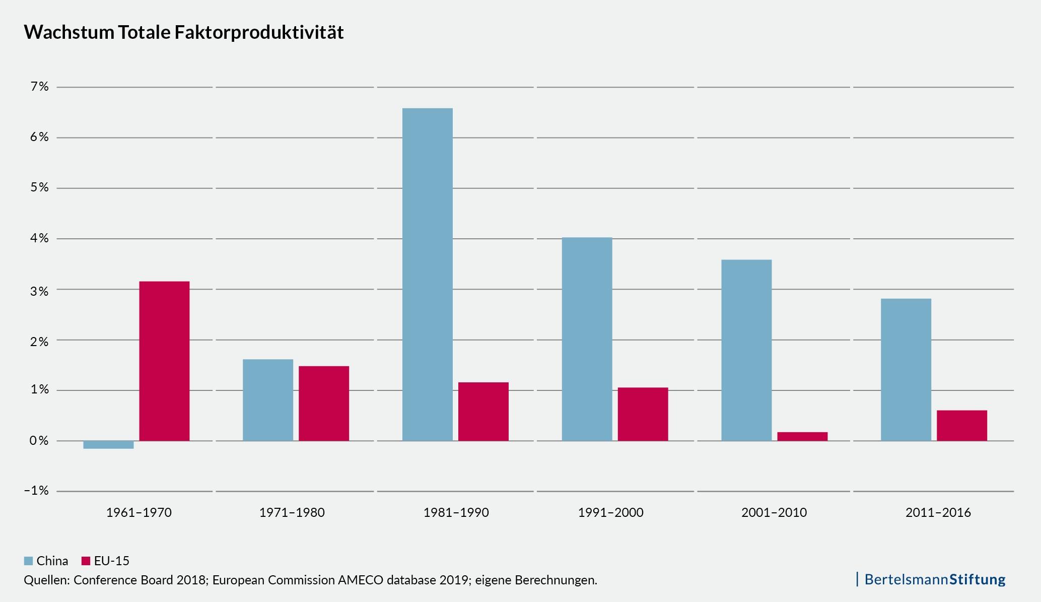 Üblicherweise wird für die Messung von Produktivität die so genannte „Totale Faktorproduktivität“ (TFP) herangezogen. Eine steigende TFP ist eine wichtige Voraussetzung für langfristiges reales Wirtschaftswachstum und Kennzahl für den technologischen Fortschritt. Das stagnierende Produktivitätswachstum in Deutschland und der EU kann unter anderem vor dem Hintergrund folgender Aspekte gesehen werden: