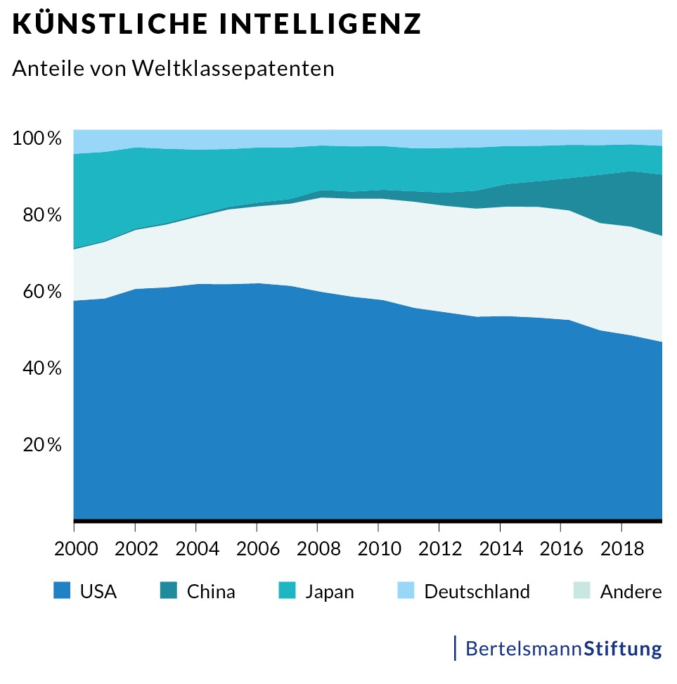 Die Ergebnisse zeigen eindrucksvoll, dass die USA ihre Vorrangposition bei den Patenten von Weltklasse noch längst nicht eingebüßt haben. Im Jahr 2000 hielten die Vereinigten Staaten bei 55 von 58 in der Studie betrachteten Zukunftstechnologien die meisten Patente auf Weltklasseniveau. Bis zum Jahr 2019 ist diese Zahl nur leicht rückläufig. Überraschenderweise rangieren die USA noch bei 50 Technologien an der Spitze, während sie bei den anderen acht Technologien jeweils den zweiten Platz belegen. Besonders deutlich vorne findet sie sich in den Bereichen Gesundheit und Sicherheit. Auch bei der zentralen Querschnittstechnologie Digitalisierung sind die Vereinigten Staaten stark. Ein Beispiel dafür ist die Künstliche Intelligenz. Auch wenn die USA hier ein wenig an Boden verloren haben, halten sie immer noch fast die Hälfte der Weltklassepatente und haben einen soliden Vorsprung vor der zweitplatzierten Volksrepublik China.