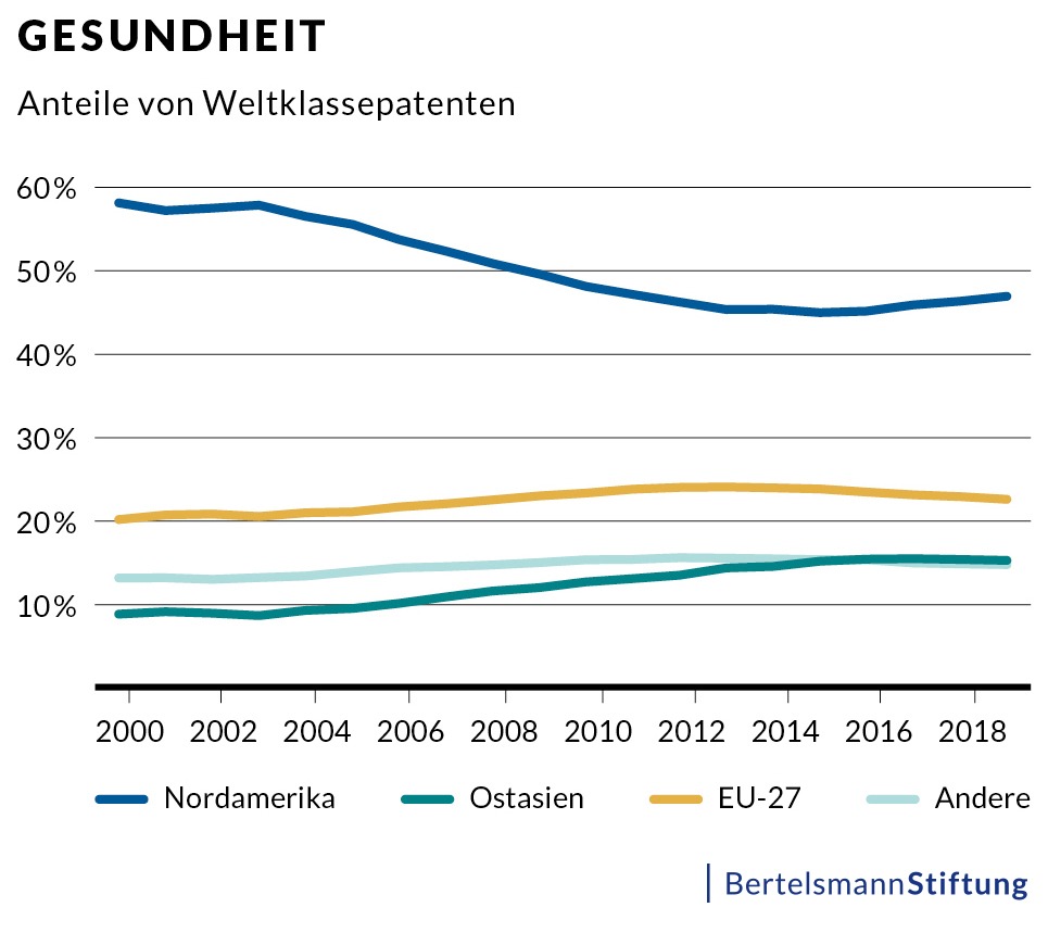 Innovation ist entscheidend für den wirtschaftlichen Erfolg. Und Patente wiederum bilden das Fundament der Innovation. Doch welches Land ist international führend im Bereich des geistigen Eigentums und welche Entwicklungen haben in den letzten beiden Dekaden stattgefunden? Bislang haben sich zahlreiche Studien lediglich auf die Anzahl der angemeldeten Patente gestützt. Eine neue Studie der beiden Projekte „Innovationskraft stärken. Potenziale erschließen.“ sowie „Global Economic Dynamics“ der Bertelsmann Stiftung konzentriert sich nun auf besonders relevante Patente in insgesamt 58 Zukunftstechnologien. Diese dürften für künftigen Wohlstand eine entscheidende Rolle spielen.