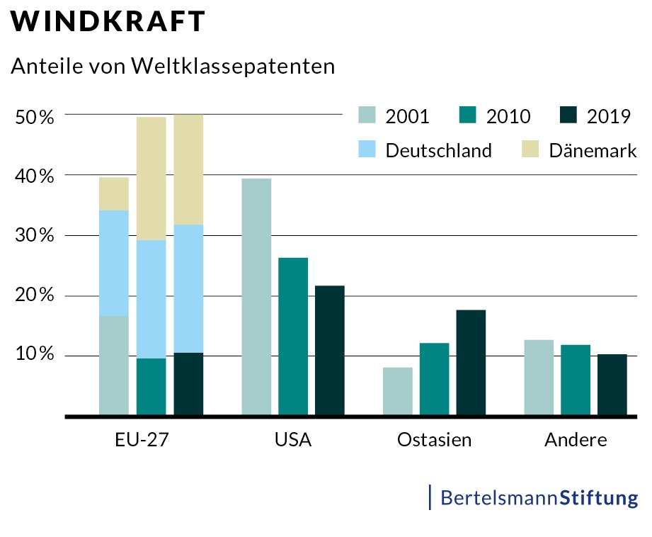 Durch den neuen Ansatz werden die wirklich wichtigen Patente in den Mittelpunkt gerückt. Windenergietechnologie ist ein gutes Beispiel, um die Diskrepanz zwischen der Überzahl an Patenten und der kleinen qualitativen Elite von Weltklassepatenten zu erklären: In der Summe gab es im September 2019 weltweit 40.011 Windenergiepatente. 16.740 davon kamen aus China. Unter diesen befinden sich jedoch nur 300 Weltklassepatente, basierend auf ihrer Marktabdeckung und ihrer Zitierung durch offizielle Prüfer in Patentämtern. Im Jahr 2019 hielt China dabei insgesamt etwa 40 Prozent der weltweiten Windenergiepatente, aber nur 6,6 Prozent der Weltklassepatente. Zum Vergleich: Deutschland hält zum September des vergangenen Jahres 958 Weltklassepatente in der Windenergie, von insgesamt 3.829 Patenten in dieser Technologie weltweit.