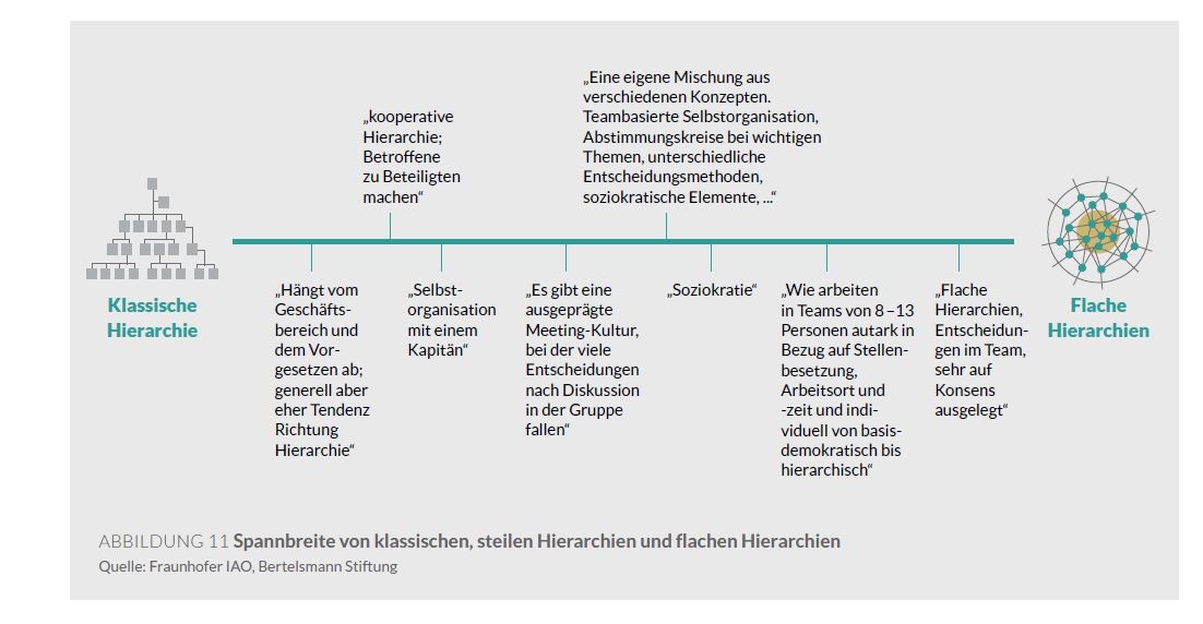 - Es hat sich gezeigt, dass klassische Hierarchien und Führungsrollen nicht schnell genau auf die Veränderung der unternehmerischen Rahmenbedingungen durch die Digitalisierung reagieren können. Es sind stattdessen neue Formen des agilen Projektmanagements, der Produktentwicklung, der agilen Entscheidungsfindung und des projektbezogenen Einsatzes von Fachkräften notwendig.