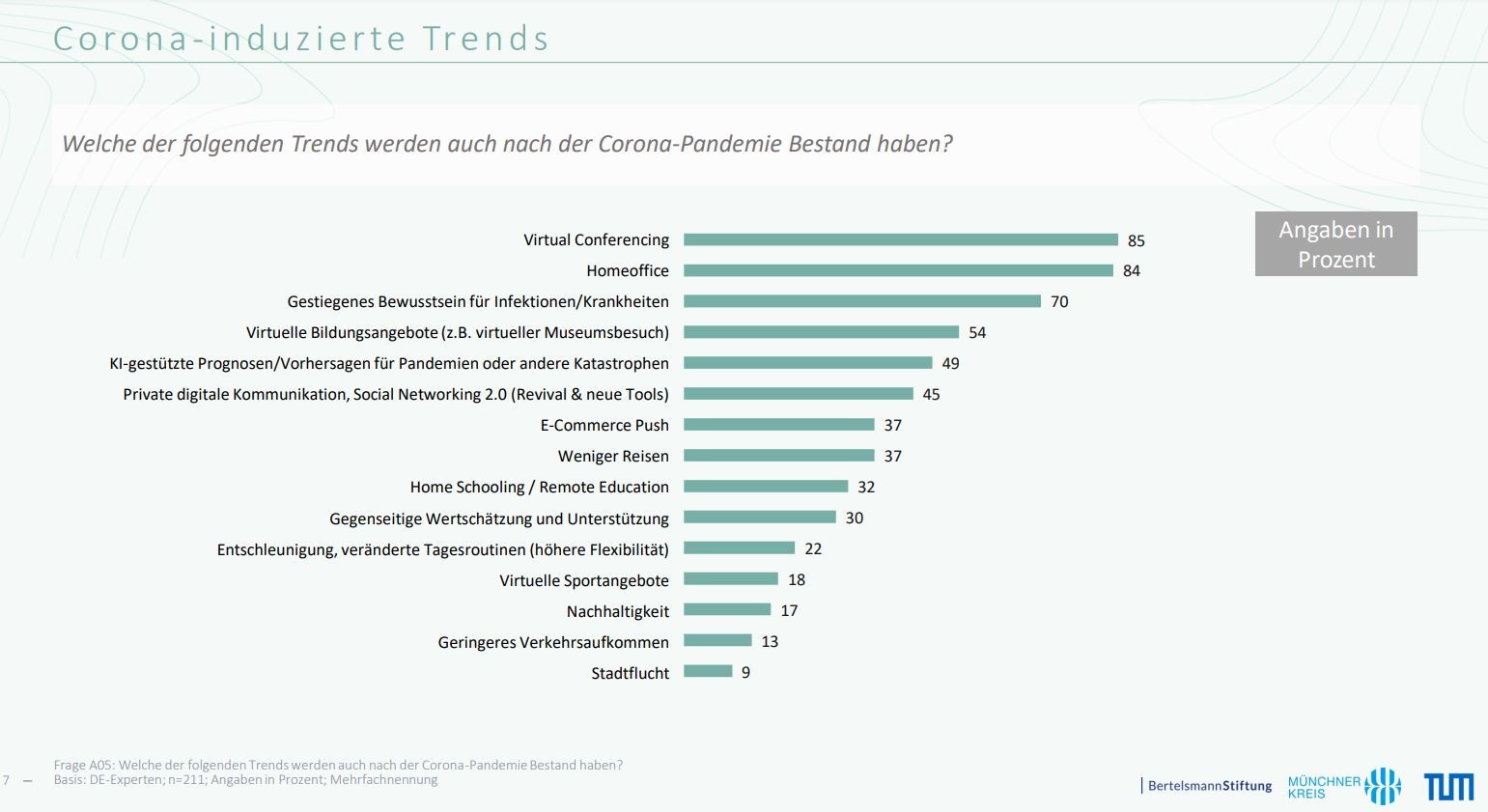In einer Corona-Sonderstudie, die wir als Begleitumfrage zu unserer mit dem Münchner Kreis herausgegebenen KI-Zukunftsstudie herausgegeben haben, lassen wir Experten des mobilen digitalen Arbeitens zu Wort kommen. Wir fragten sie nach den erwarteten Änderungen oder Verstetigungen von neuen Arbeitsweisen, die sich speziell durch die Corona-Krise ergeben hatten bzw. ergeben könnten. Die Antworten sind eindeutig (s.a. Balkendiagramme): Die digitale Arbeitskultur hat Einzug gehalten und wird nicht einfach wieder verschwinden.