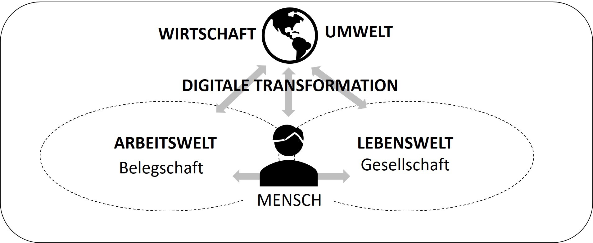 Die digitale Transformation mit ihren Auswirkungen auf Wirtschaft, Gesellschaft und Umwelt manifestiert sich auf vielfältige Art in unserer heutigen Arbeits- und Lebenswelt. Unternehmen tragen hier eine besondere Verantwortung für die Auswirkungen ihres Handelns auf die Gesellschaft im Allgemeinen – hinsichtlich sozialer, ökologischer und ökonomischer Aspekte –, aber auch auf die Arbeitswelt der eigenen Belegschaft im Besonderen. Der Mensch als Individuum nimmt im doppelten Sinne an der digitalen Transformation teil: zum einen als arbeitende Person und Akteur im globalen Wirtschaftssystem (z.B. als Produzent:in, Dienstleister:in, Lieferant:in, Politiker:in) und zum anderen als Privatperson und Mitglied der Gesellschaft (als Kund:in, Konsument:in, im Ehrenamt etc.).