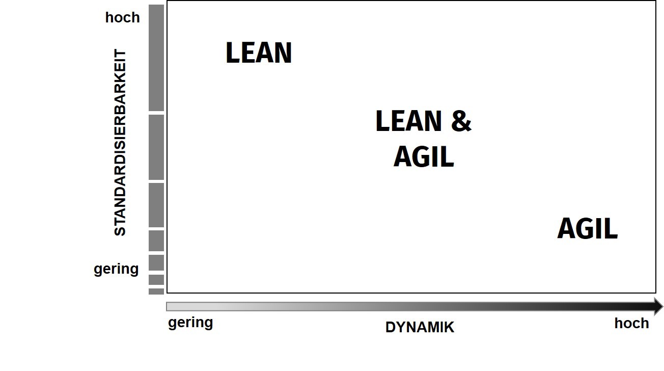 Wann welche der beiden Arbeitsweisen jeweils mehr Vorteile bietet, kann auch anhand von Modellen aus dem Kontext des Komplexitätsmanagements entschieden werden, wie etwa der Stacey-Matrix von Ralph D. Stacey oder dem Cynefin-Modell von Dave Snowden. Ein etwas konkreter gefasstes Rahmenmodell beschreibt einen Raum, der Kundenanforderungen sowie Umfeldbedingungen, in denen gearbeitet wird, auf zwei Achsen in Bezug zueinander setzt (Abbildung 3). In einem Umfeld, in dem es aus Kundensicht vor allem auf Stabilität, Qualität und Zuverlässigkeit ankommt, sind Lean-Prinzipien und -Methoden daher gut geeignet, die Optimierung bekannter Produkte und bestehender bzw. standardisierter Prozesse zu realisieren.