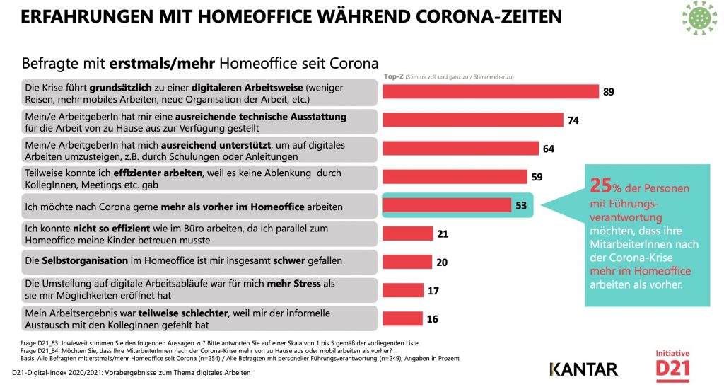 Eine starke Diskrepanz ergibt sich jedoch bei der Abfrage der Präferenz für Home Office zwischen Arbeitnehmerinnen und Führungskräften. Während 53% der Arbeitnehmerinnen nach Corona mehr als vorher im Home Office arbeiten möchten, unterstützen dies aber nur 25% der zugeordneten Führungskräfte.