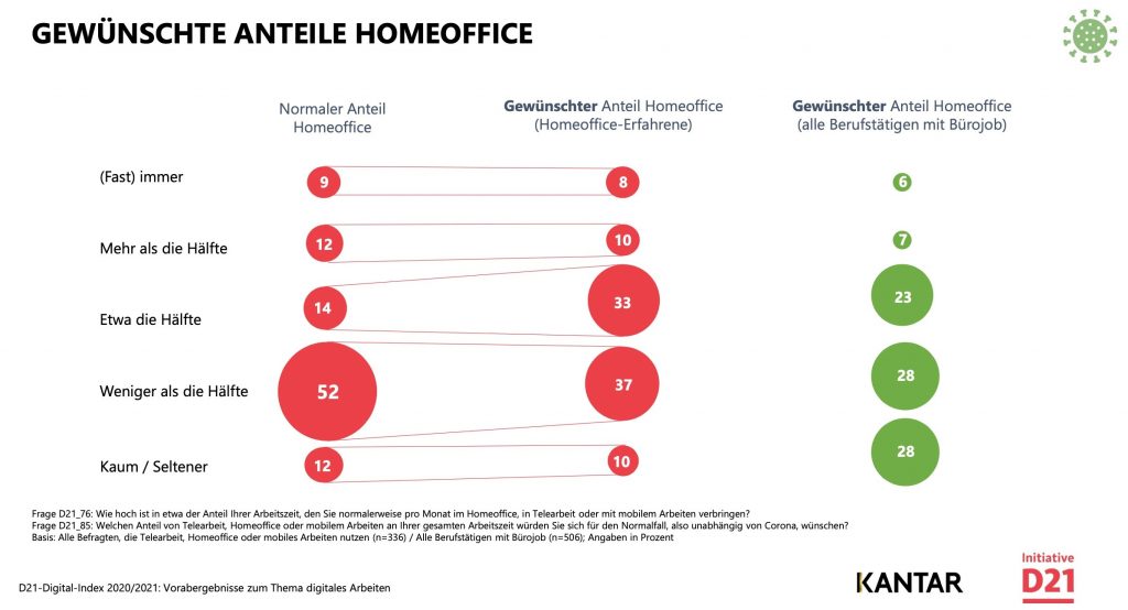 Home Office ist derzeit eine einfache Möglichkeit, die eigene und die Gesundheit der Mitmenschen zu schützen. Auch schon vor Corona hat sich in den Zahlen der Digital Indizes der letzten Jahre gezeigt, dass mobiles Arbeiten generell für die Mehrheit der Menschen eine Option ist, um Lebensqualität und Vereinbarkeit zu steigern, ganz zu schweigen von den weiteren externen positiven Effekten des mobilen Arbeitens, die wir selbst vor kurzem in unserer Trendstudie zum Coworking dargestellt hatten.