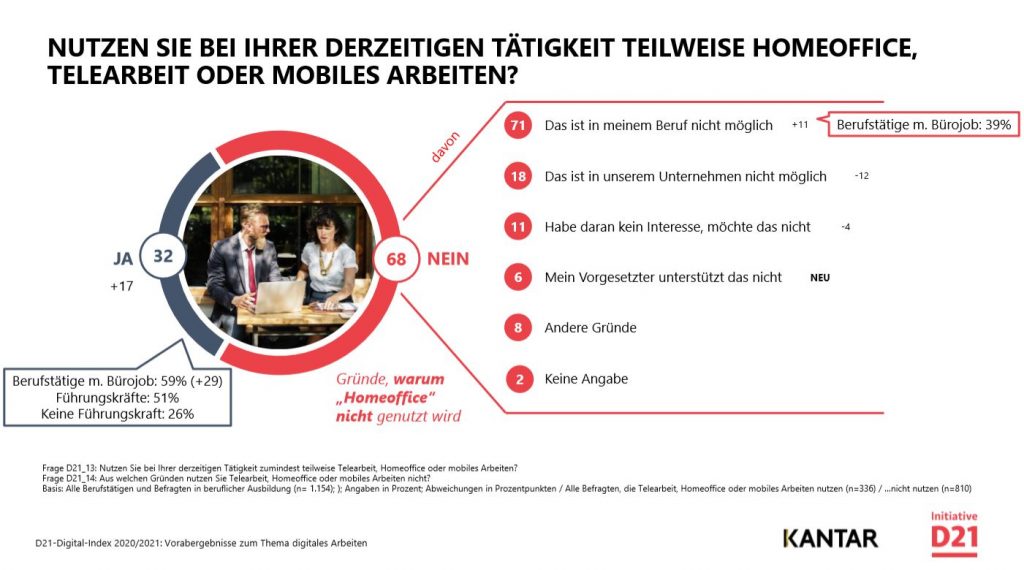 32% der Berufstätigen in Deutschland und sogar 59% der im Büro Tätigen nutzten im Befragungszeitraum ab und zu oder regelmäßig Home Office. Damit sprechen wir hier und im Folgenden von zumindest 11 Millionen Menschen (bezogen auf den Status „Beschäftigte“), die Fragen des Home Office unmittelbar in ihrer täglichen Arbeit betreffen. Von den Menschen, die dies nicht nutzen, gibt die überwiegende Mehrheit an, dass dies in ihrem Beruf nicht möglich sei. Ungefähr jede Fünfte (wegen der Mehrfachnennungen an dieser Stelle ist keine eindeutige Prozentangabe möglich) gibt dabei an, dass ihre Arbeitgeberin oder die Vorgesetzte dies nicht ermöglichen würde.