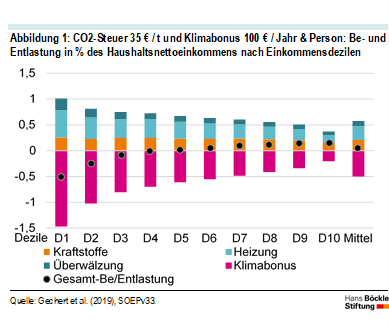 Abbildung 1 zeigt die Be- bzw. Entlastungswirkung in Prozent des jährlichen Haushaltsnettoeinkommens durch eine CO2-Bepreisung von 35 € je Tonne in Kombination mit einem Klimabonus von 100 € pro Jahr und Person entlang der Einkommensverteilung nach Dezilen.  Die CO2-Steuer wirkt regressiv. Sie belastet Haushalte mit kleinen Einkommen anteilig an ihrem Einkommen am stärksten, insbesondere aufgrund steigender Heizkosten. Der Klimabonus als fester Betrag pro Kopf entlastet Geringverdiener anteilig dagegen umso stärker.