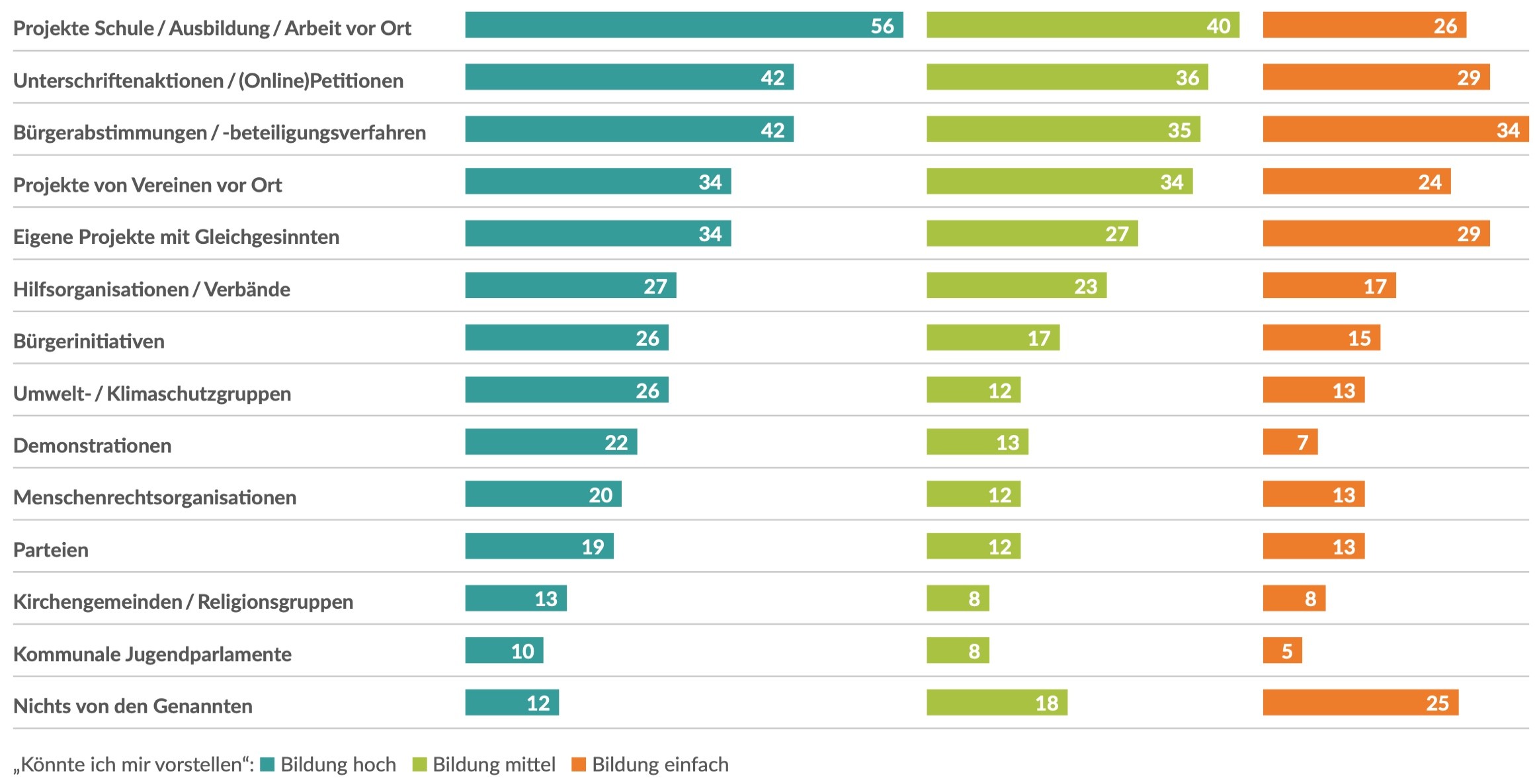 Bei der Frage der Aktivitätsformen, mit denen für mehr Nachhaltigkeit in der Gesellschaft geworben werden kann, rangieren klassische Formen der Beteiligung wie Jugendparlamente und Parteien auf den letzten Plätzen der Rangliste. Flexible, lokale und auch digital durchführbare Aktionen werden von den jungen Menschen als am wichtigsten erachtet.