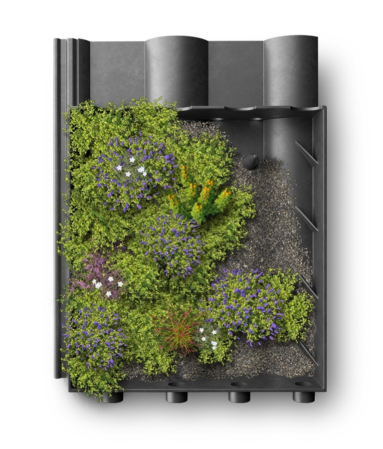 Wir haben begrünte Dachpfannen entwickelt. Sie ist an eine herkömmliche Dachpfanne angelehnt, aber mit einem Trägersystem versehen, das Vegetation aufnehmen kann. Man kann sich das, vereinfacht gesagt, wie eine konventionelle Dachpfanne mit integrierten Blumenkasten vorstellen.