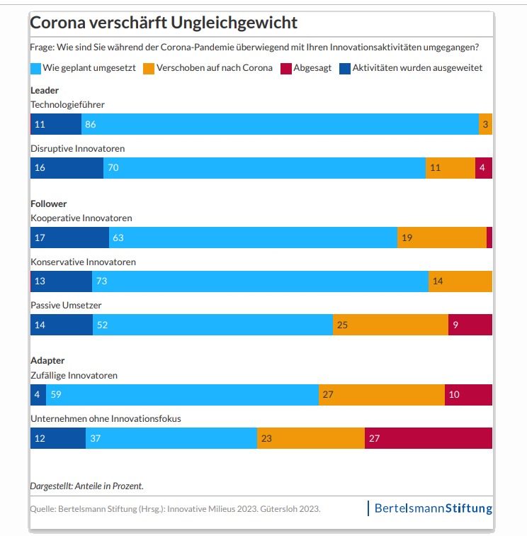 Bei der Analyse der einzelnen Milieus tritt klar zutage, dass die innovationsaktiven Milieus, also Technologieführer, Disruptive Innovatoren, Kooperative Innovatoren und Konservative Innovatoren, eine deutlich höhere Resilienz gegenüber der Corona-Pandemie entwickeln konnten als die übrigen Milieus. In den innovationsstarken Unternehmen wurden zuvor geplante Innovationsvorhaben wie geplant durchgeführt und oft sogar noch erweitert. Für die wachsende Gruppe der innovationsfernen Unternehmen gilt das Gegenteil. Viele ursprünglich geplante Vorhaben wurden während der Coronapandemie verschoben oder sogar abgesagt.