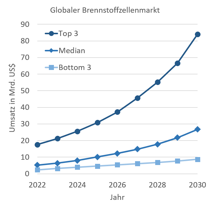 Kommerzielle Marktstudien versprechen ihren Käufern einen Einblick in das gegenwärtige und künftige Marktgeschehen. Die Aggregation von Daten aus werblichen Zusammenfassungen der Anbieter einschlägiger Berichte ermöglicht eine Meta-Analyse, die die Verteilung der Markterwartungen für Brennstoffzellen nachzeichnet: Prognosen beziffern jährliche Wachstumsraten zwischen 10 und 41 Prozent, wobei die große Mehrheit der betrachteten Studien von einem mittleren Wachstum zwischen 15 und 30 Prozent ausgeht. Für das Jahr 2030 ergeben sich daraus erwartete Marktvolumina von knapp 2 bis 87 Mrd. US-Dollar.