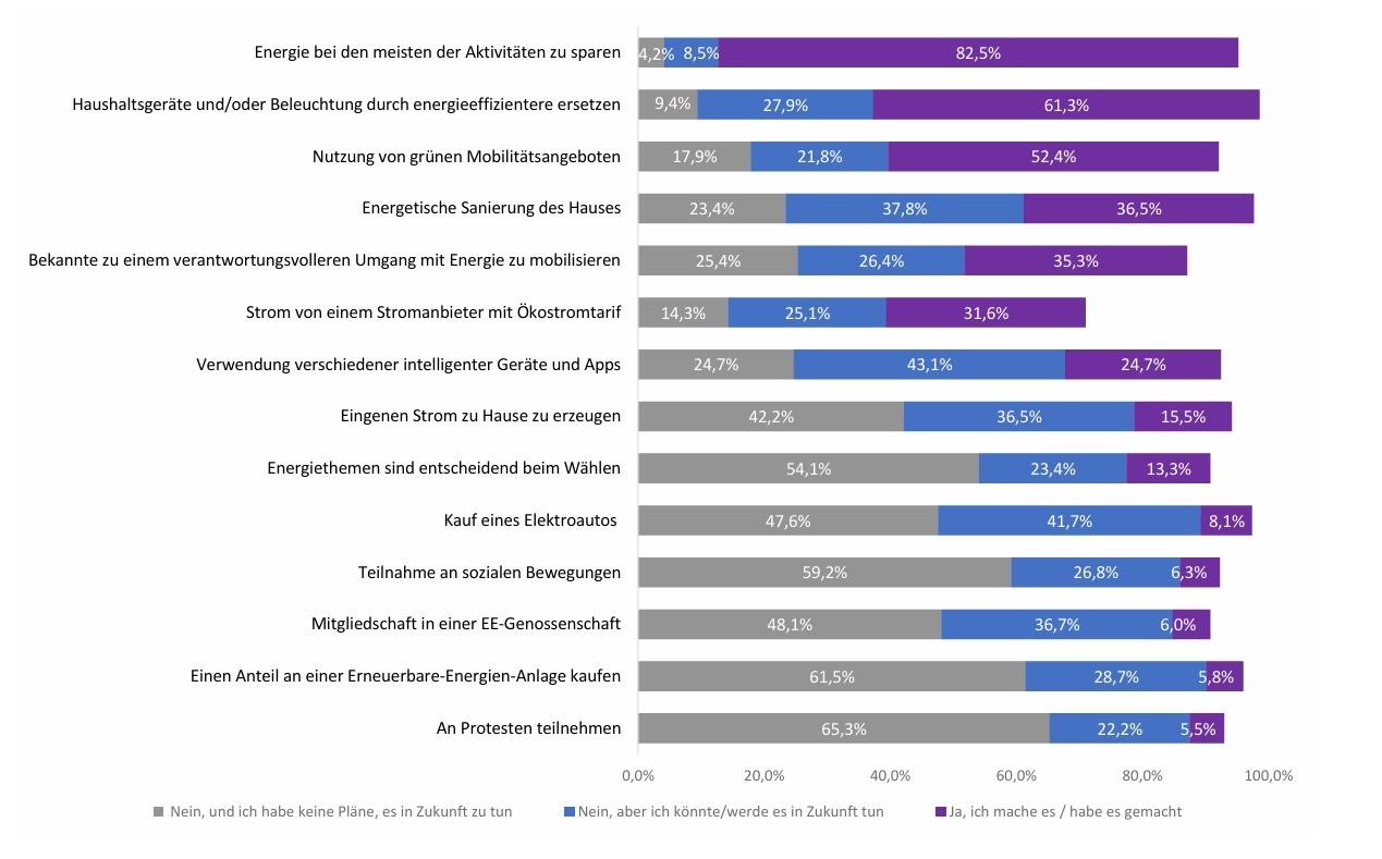 Gefragt danach, in welchen Bereichen sie ihr energiebezogenes Verhalten bereits geändert haben, werden von einem hohen Anteil der Befragten Aktivitäten im Privathaushalt aufgeführt, wie Energiesparen und der Austausch von Haushaltsgeräten und/oder Beleuchtung. Über die Hälfte gibt an, sich häufiger klimafreundlich zu Fuß, mit dem Fahrrad oder öffentlichen Verkehrsmitteln und weniger mit dem privaten Auto zu bewegen.