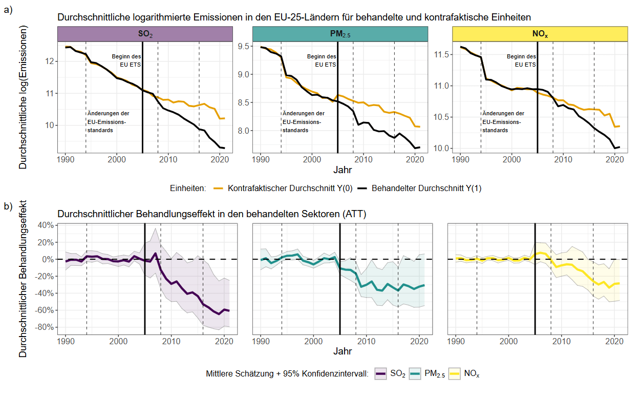 Die Abbildung stellt die Ergebnisse unserer Studie dar. Die schwarzen Linien in den oberen Grafiken (a) zeigen deskriptiv, wie sich die Emissionen der drei oben beschriebenen Luftschadstoffe in den vom Emissionshandel erfassten Sektoren („behandelte“ Sektoren) im Durchschnitt von 25 europäischen Ländern zwischen 1990 und 2021 entwickelt haben.