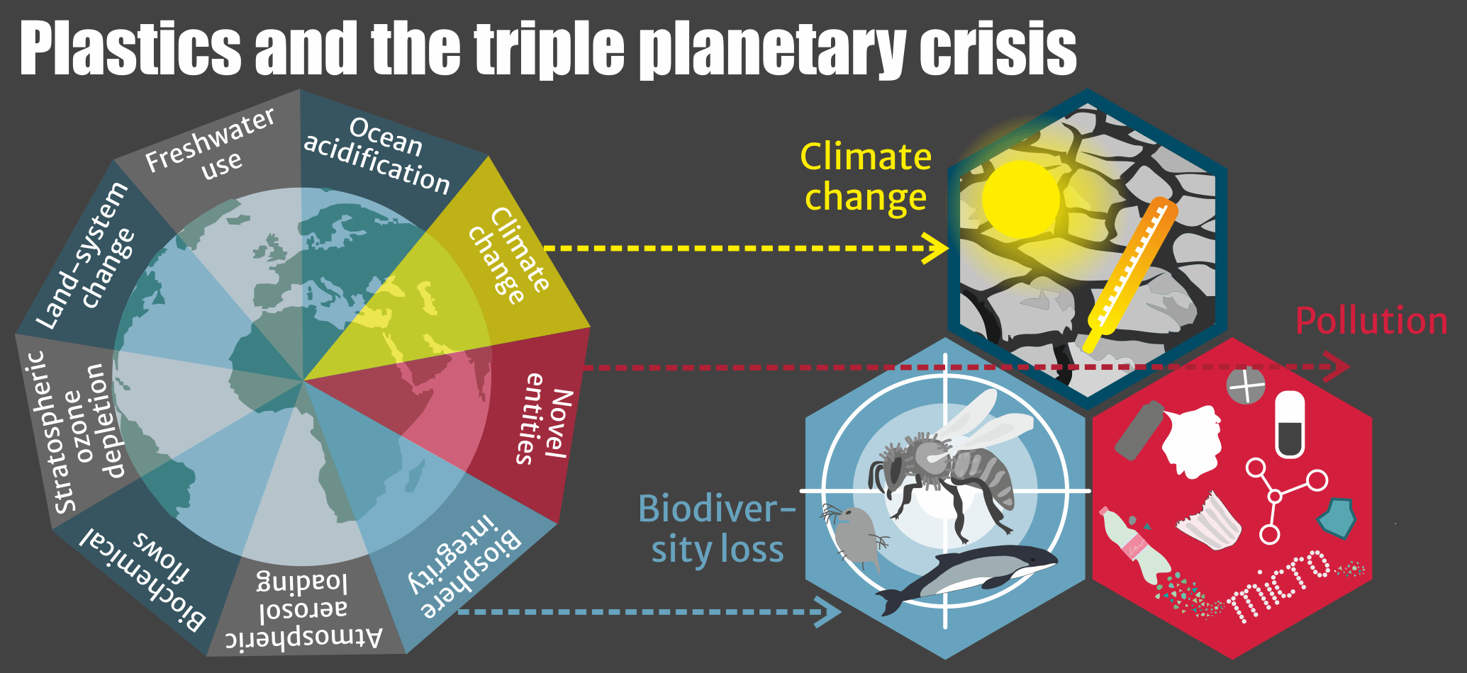 Plastik ist insgesamt ein weithin sichtbarer, aber auch durch abgegebene Chemikalien unsichtbarer Hauptfaktor in der Verschmutzungskrise. Die Herstellung und Entsorgung von Plastik verschärft jedoch auch den Klimawandel, beispielsweise durch die Emission von Treibhausgasen während der Herstellung. Ebenso trägt Plastik zum Verlust der Artenvielfalt bei, zum Beispiel durch die Freisetzung von toxischen Chemikalien. Eine reine Fokussierung auf das Müllproblem greift also zu kurz.