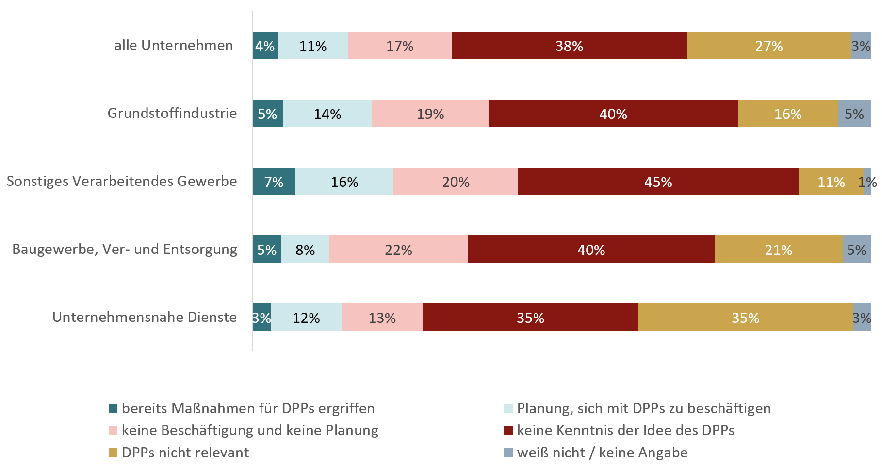 Auffallend ist, dass nur zwei Drittel der unternehmensnahen Dienstleister DPPs als relevant für ihr Geschäftsmodell erachten. Ausschlaggebend könnte eine (noch) fehlende Erkenntnis sein, dass DPPs den ganzen Produktlebenszyklus und somit potenziell auch ihre Serviceleistungen während und nach der Nutzungsphase eines Produkts betreffen werden.
