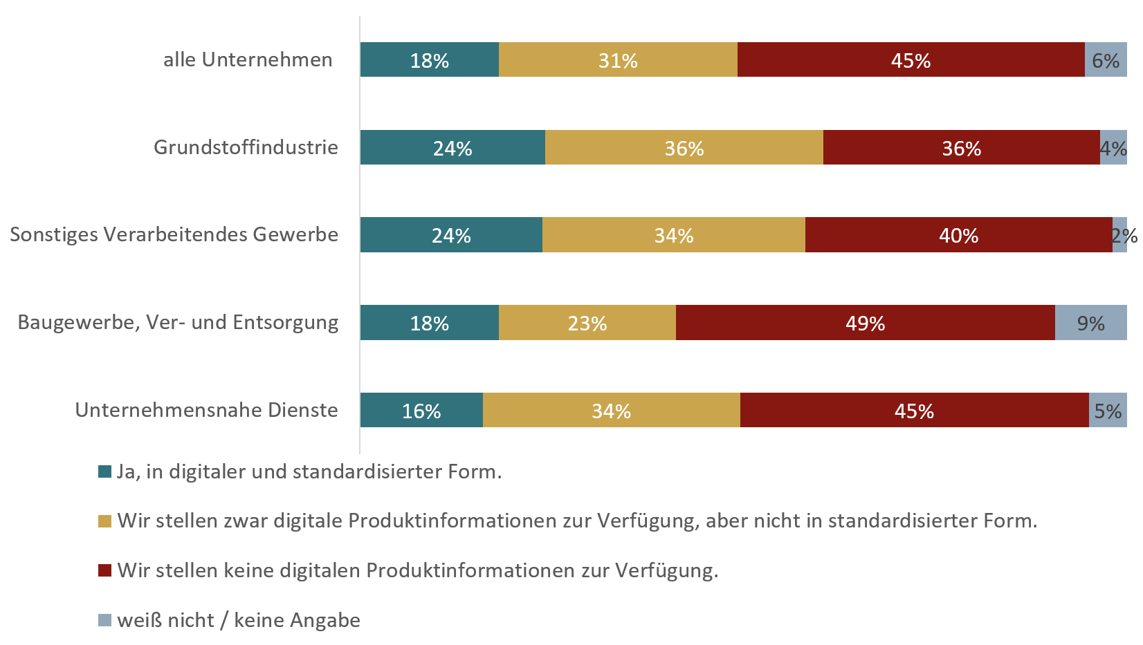 Für den Erfolg von DPPs sind standardisierte digitale Produktinformationen wichtig, aber die Realität sieht anders aus: Nur etwa die Hälfte der befragten Unternehmen in der Industrie und unternehmensnahen Diensten stellen ihren Kunden, Lieferanten oder anderen Partnern digitale Produktdaten bereit, lediglich 18 Prozent davon in standardisierter Form (Abbildung 2).