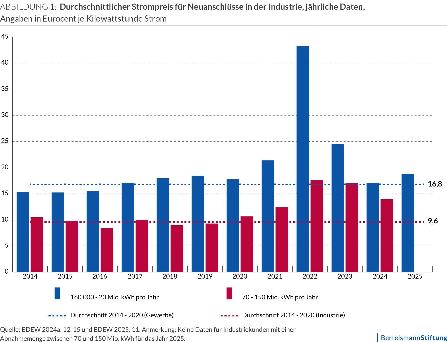 Immerhin erreichten sie im Durchschnitt des Jahres 2024 zumindest für Gewerbebetriebe wieder das durchschnittliche Niveau der Jahre 2014 bis 2020 (siehe Abb. 1). Gewerbebetriebe sind Unternehmen mit einer jährlichen Verbrauchsmenge von 160.000 bis 20 Millionen Kilowattstunden Strom.