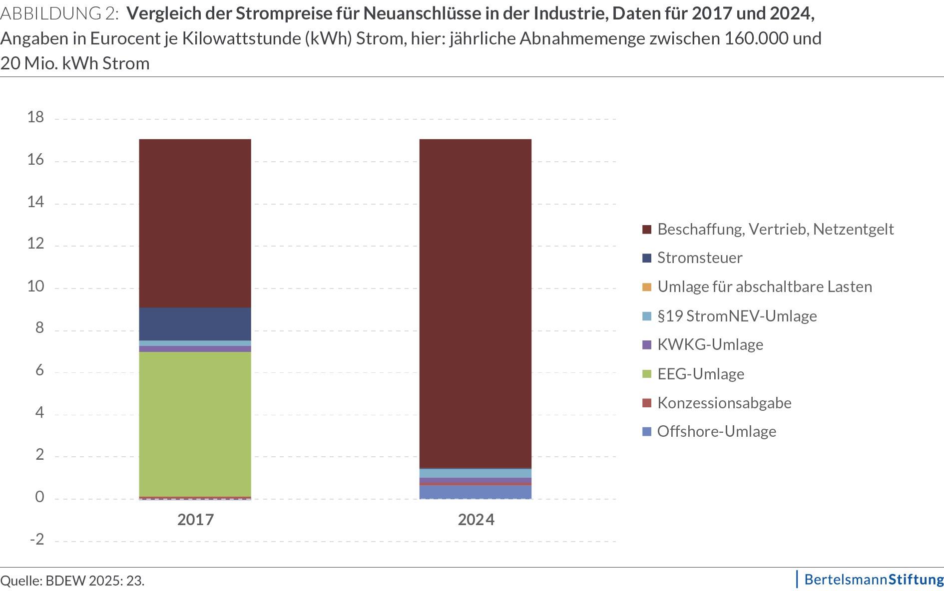 2017 machte die Summe aus Steuern, Abgaben und Umlagen rund 53 Prozent dieses Preises aus. 2024 waren es weniger als 9 Prozent (siehe Abb. 2). Ein maßgeblicher Treiber dieser Entwicklung der staatlichen Strompreisanteile ist die Umstellung der Förderung der erneuerbaren Energien.