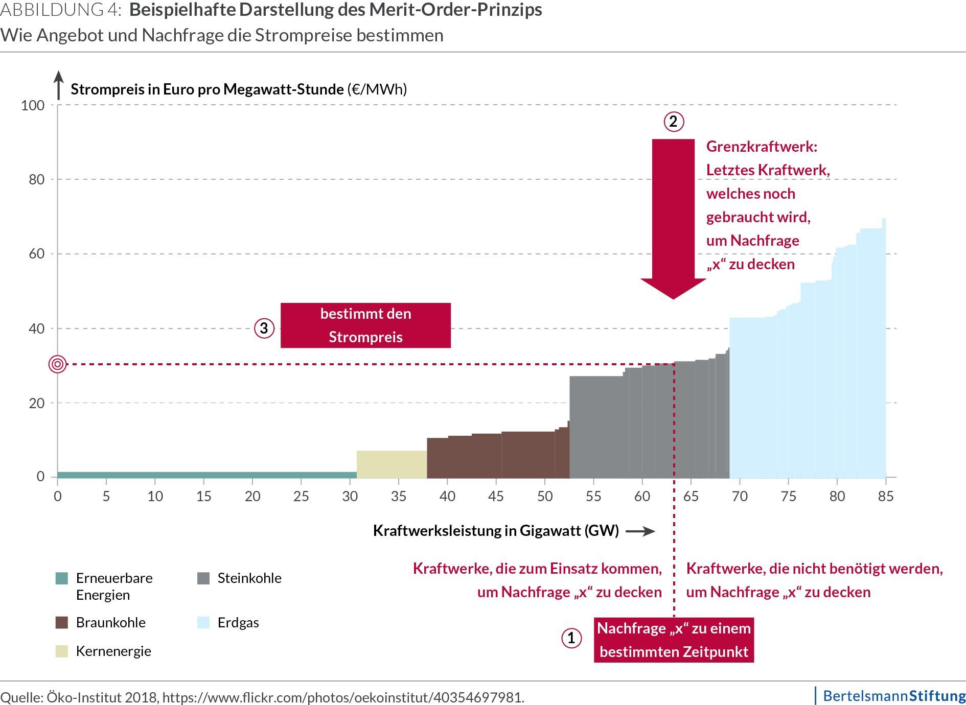 Der Preis an den Strombörsen bildet sich mithilfe des so genannten Merit-Order-Prinzips. Die potenziellen Stromanbieter werden dabei entsprechend ihrer Stromerzeugungskosten geordnet. Der letzte Anbieter, der benötigt wird, um die Stromnachfrage zu einem bestimmten Zeitpunkt zu decken, bestimmt mit seinen Grenzkosten den zu zahlenden Strompreis. Grenzkosten sind die zusätzlichen Kosten, die die letzte hergestellte Einheit verursacht (siehe Abb. 4).