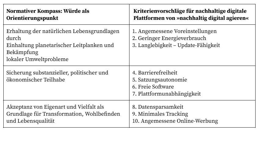 Tabelle 1: Tabelle 1: Die drei Dimensionen des normativen Kompasses und Kriterienvorschläge (übernommen aus Wohlstand in Zeiten des Übergangs, S. 430: Quellen dort benannt: WBGU 2019: S. 35 ff.; nachhaltig digital agieren 2021: S. 8)