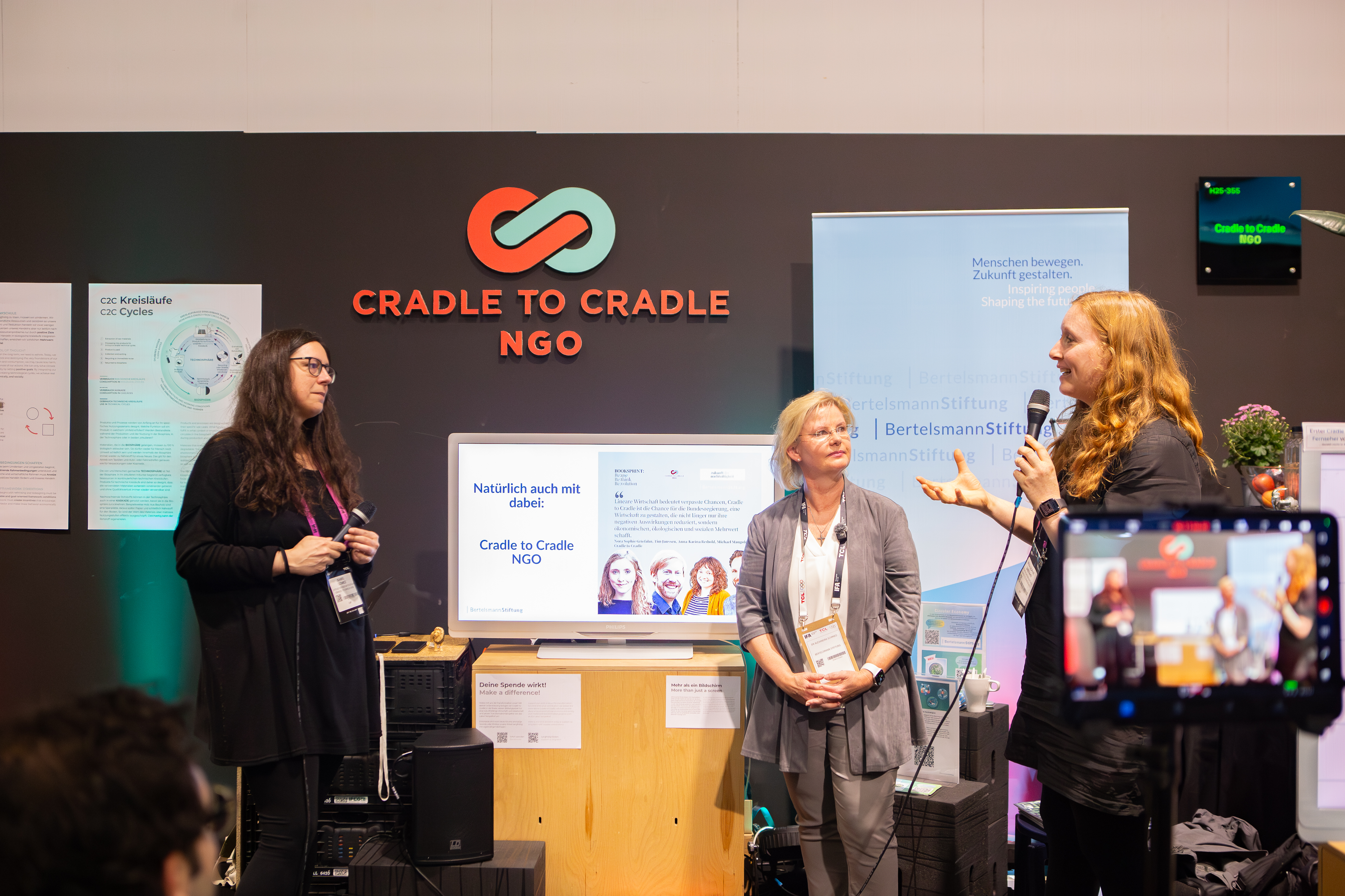 An unserem Messestand und auf den Bühnen der IFA konnten wir gemeinsam mit Cradle to Cradle NGO, Unternehmen und Verbänden darüber diskutieren, wie Produkte von morgen gestaltet werden können. Es ging um Fragen des Designs, innovative Geschäftsmodelle, faire sowie verlässliche Lieferketten und gesunde Materialien – also darum, wie Produkte Teil der Lösung werden können statt Teil des Problems.