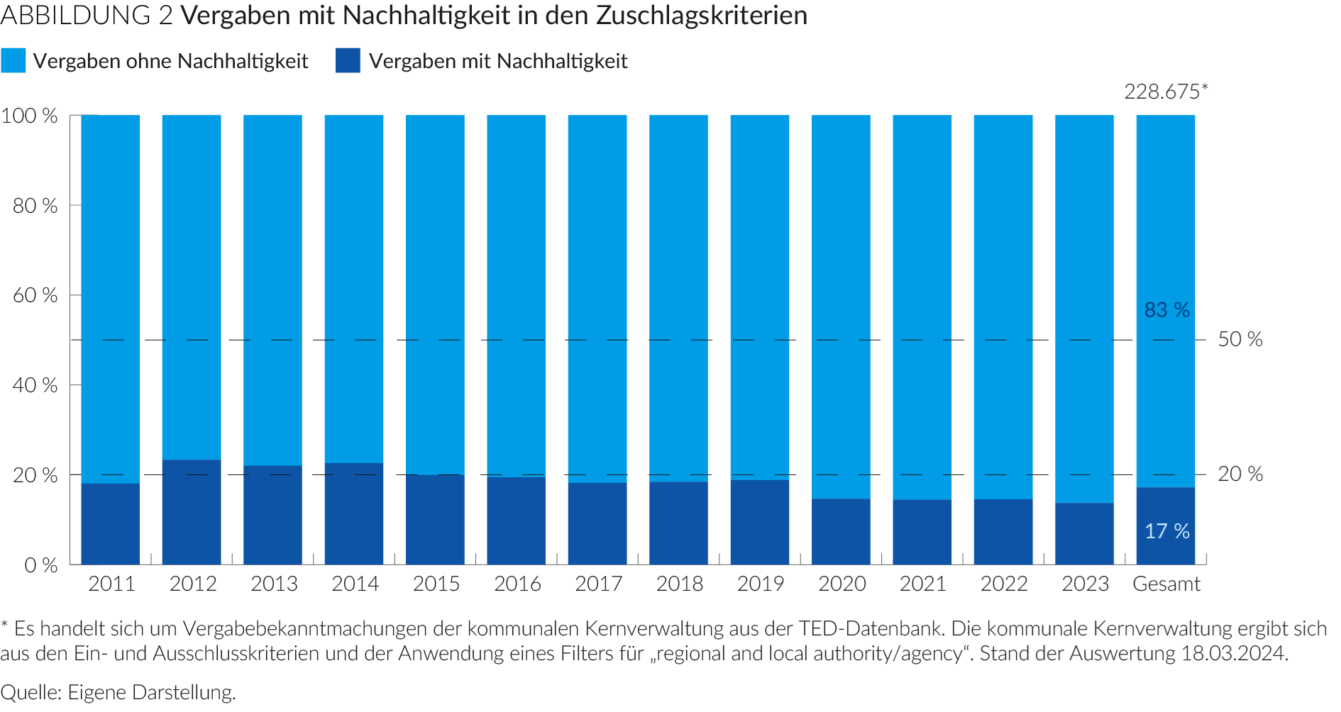 Doch trotz dieses Rechtsrahmens nutzt die öffentliche Hand bislang kaum ihr Potenzial als Treiberin der Nachhaltigkeitstransformation. So wurden laut Vergabestatistik im Jahr 2021 auf allen föderalen Ebenen gerade einmal bei 13 Prozent der Vergaben Nachhaltigkeitskriterien berücksichtigt (vgl. Kozuch et al. 2024: 18). Eine Studie der Universität der Bundeswehr München im Auftrag und in Zusammenarbeit mit der Bertelsmann Stiftung vertieft diese Thematik in zweierlei Hinsicht auf Ebene der deutschen Kommunen. Zum einen analysiert sie deutlich differenzierter als die Vergabestatistik, welche Aspekte der Nachhaltigkeit – unter anderem auch die Kreislaufwirtschaft – von den Kommunen bei Vergaben berücksichtigt werden. Und zum anderen ermöglicht sie durch die Nutzung der Daten der europäischen Datenbank „Tenders Electronic Daily“ im Gegensatz zur Vergabestatistik eine Zeitreihe seit dem Jahr 2011, anhand derer Trends im Beschaffungsverhalten der öffentlichen Hand nachvollzogen werden können.