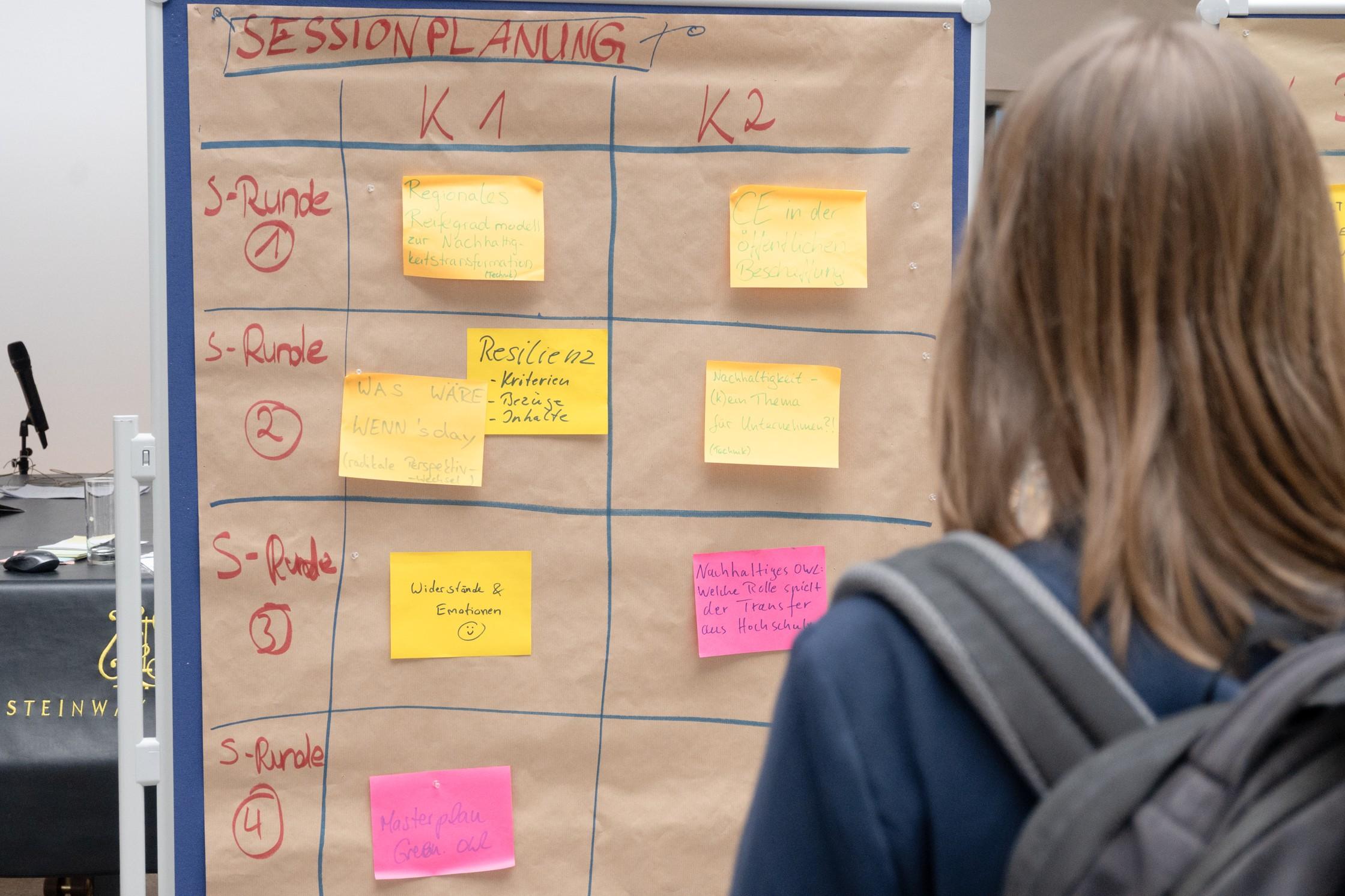 Nach einem offenen Check-In und einer kurzen Begrüßung ging’s ohne Umwege zur Sessionplanung – dem Herzstück eines jeden BarCamps. Kaum zehn Minuten später war das Themenboard voll: KI-gestützte Ressourceneffizienz, nachhaltige Beschaffung, emotionale Transformation, psychologische Dynamiken des Wandels und vieles mehr.